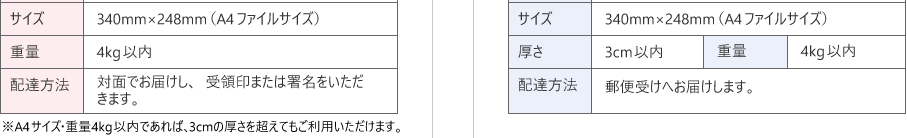 兩種共通規(guī)則,尺寸A4大小,340毫米乘以248毫米,重量最多4千克。注意!雖然重量上限很高,但有厚度限制。