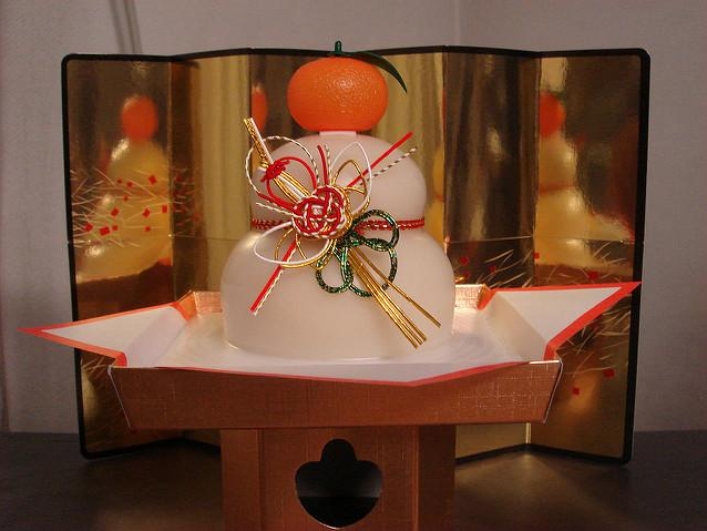 日本人在過節(jié)前一定會準(zhǔn)備鏡餅,那是給“年神”的供品。據(jù)說新年期間的1月1-7日,神靈的魂魄會留宿在鏡餅里。而直到1月11日才能開“開鏡餅”。鏡餅是一種類似于年糕類的用糯米作的食物,最上層再放一個橙子(だいだい),意思是具有幸福好運(yùn)“代代相傳”的寓意。