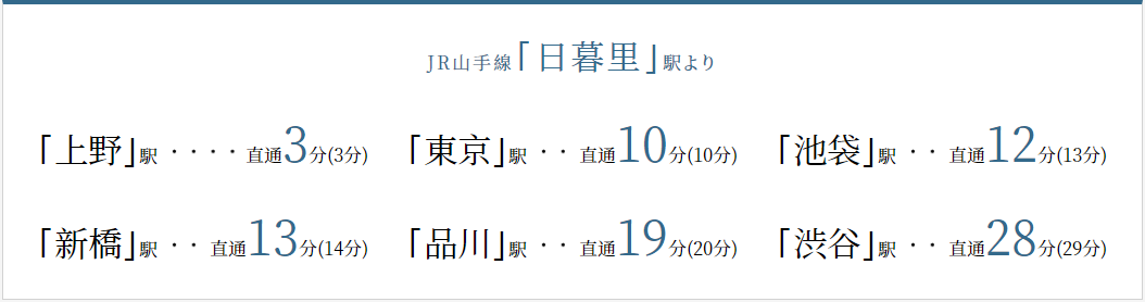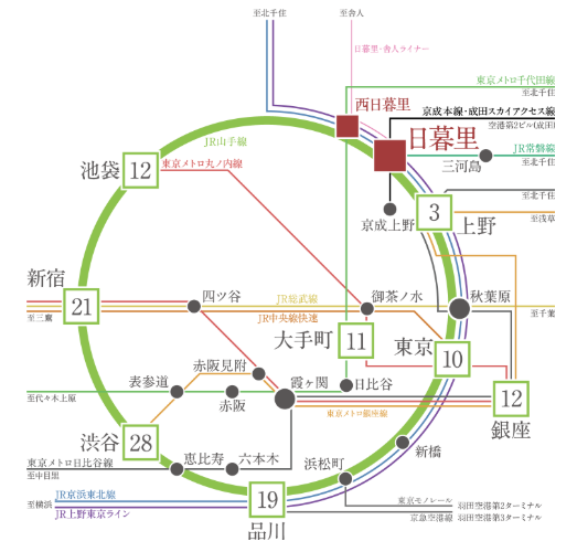 例如,乘坐山手線從日暮里乘電鐵直達上野站僅需約3分鐘、直達東京站約10分鐘、直達池袋約12分鐘、直達品川約19分鐘、直達澀谷約28分鐘。