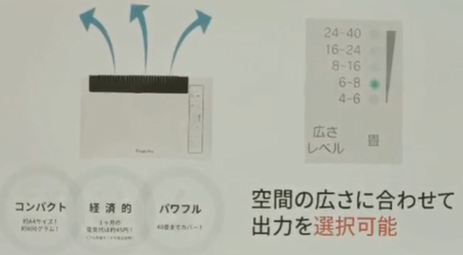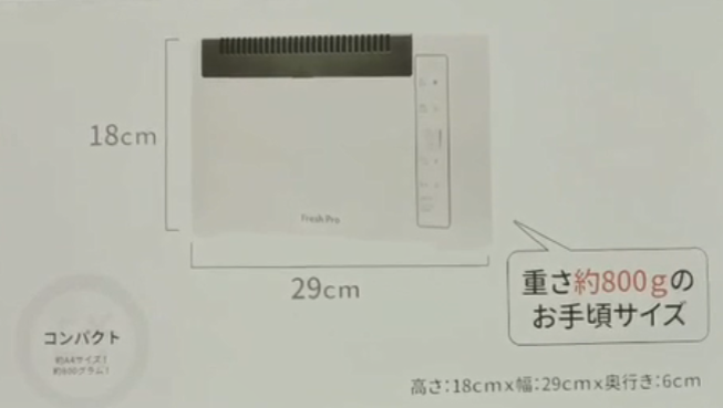 Fresh pro新型臭氧空間除菌機僅有A4紙張大小,重量僅為800克, 可對應空間大小為最小6.5平米~最大66平米,對應空間大小可在本體調節。電源為100V~240V,無需轉換器,耗電量為7W,每月電費約為2.8元。