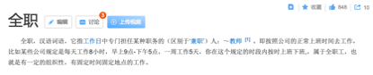 全職,在百度詞條里的解釋是:“按照公司的正常上班時間去工作,在這個規(guī)定的時段內(nèi)按時上班下班,,屬于全職工,有一定的組織性,有固定工作時間固定工作地點。”