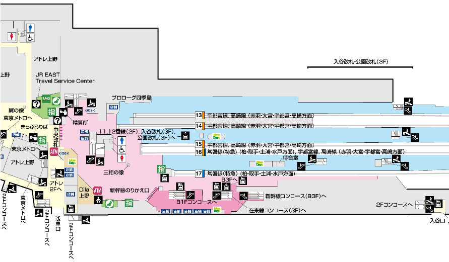 JR上野車站規(guī)模較大,地上3層、地下4層,通常從JR下車時是在2層月臺,地下一般是新干線各站臺。如果想去阿美橫丁等的“中央檢票口”、“不忍檢票口”的話,可下到1層;前往上野公園的“公園檢票口”的話,可以上到3層。但是如果出錯檢票口的話,可能就需要多走會兒才能到達目的地了。JR上野車站內的站臺較多,如果擔心迷路的話,建議從“中央檢票口”出,這里不但是最大的檢票口,而且出站后右手就有問訊處(Travel Service Center),問路也很方便。