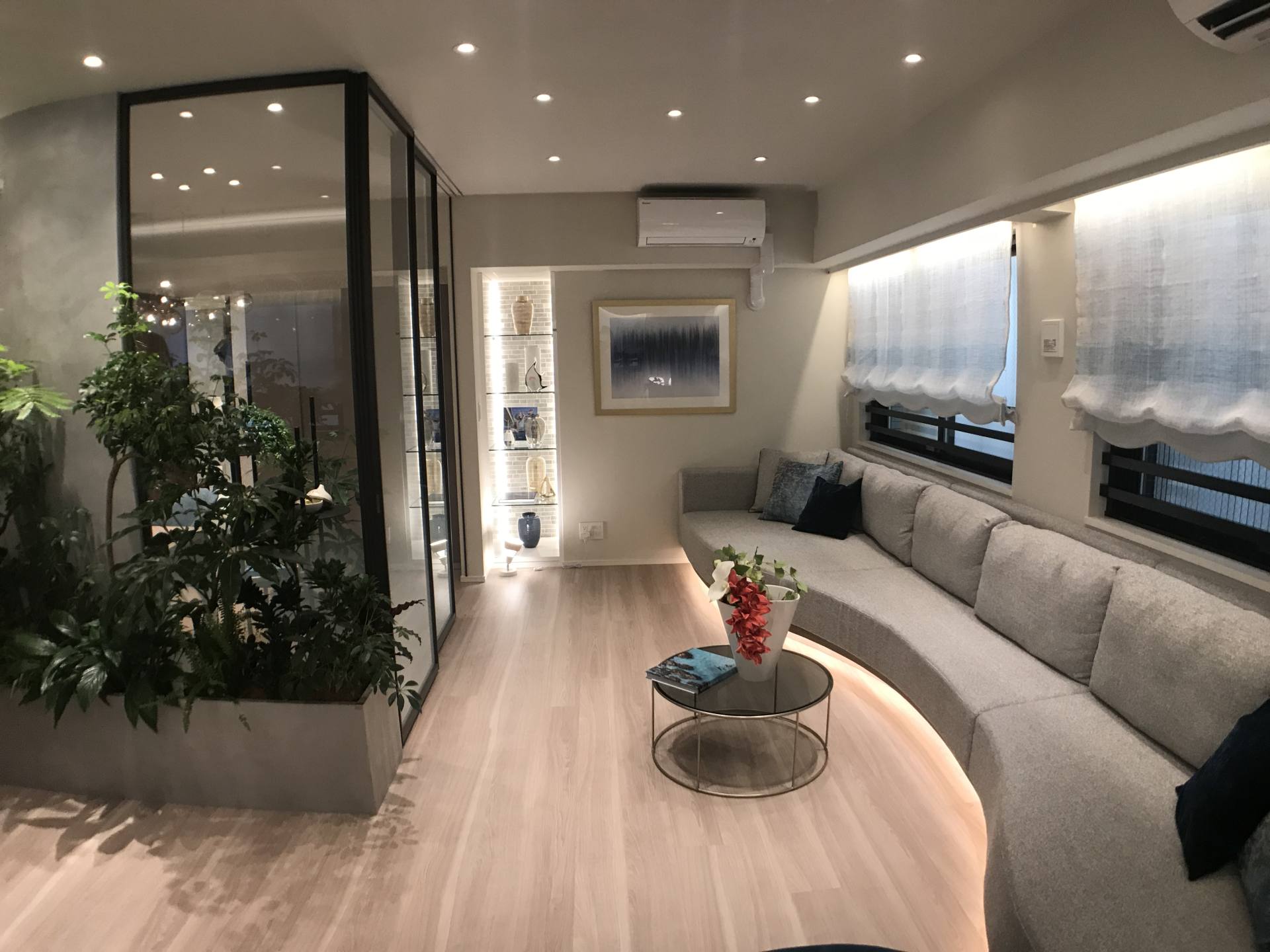 日本的設計師非常擅長放大面積的空間感,70平方米左右的面積看起來更像豪宅的寬敞明亮。特別是新冠肺炎疫情席卷全球以來,在家辦公成為生活的主要模式,家里不單是休息的地方,更是承擔了日常辦公的功能。拆掉書房的隔斷墻,以落地玻璃隔斷取而代之,并一反常態地將直角墻改為弧形,空間更顯靈動,私人辦公室的時尚感立馬呈現出來。而且玻璃隔斷墻也打破了以往“一隔到窗”的設計,而是根據功能和需求協調空間,增加了客廳的面積。在視覺效果上,玻璃書房更顯通透,視覺空間寬敞。延伸的客廳也顯得寬敞大氣,即使同事一起開會都不成問題。書房采取了“雙門”設計,可以根據需要隨時切換“公、私”的空間,兩個門都打開時書房便成了背景墻,室內空間更顯得寬敞通透,使用更方便。而使用玻璃隔斷墻特意打造出來的綠植空間,再配合玻璃隔斷,儼然打造出了充滿氧氣的植物園,再配合廚房、臥室、陽臺等擺放的綠植,相互呼應,讓人感嘆生活的在自然中的美好。