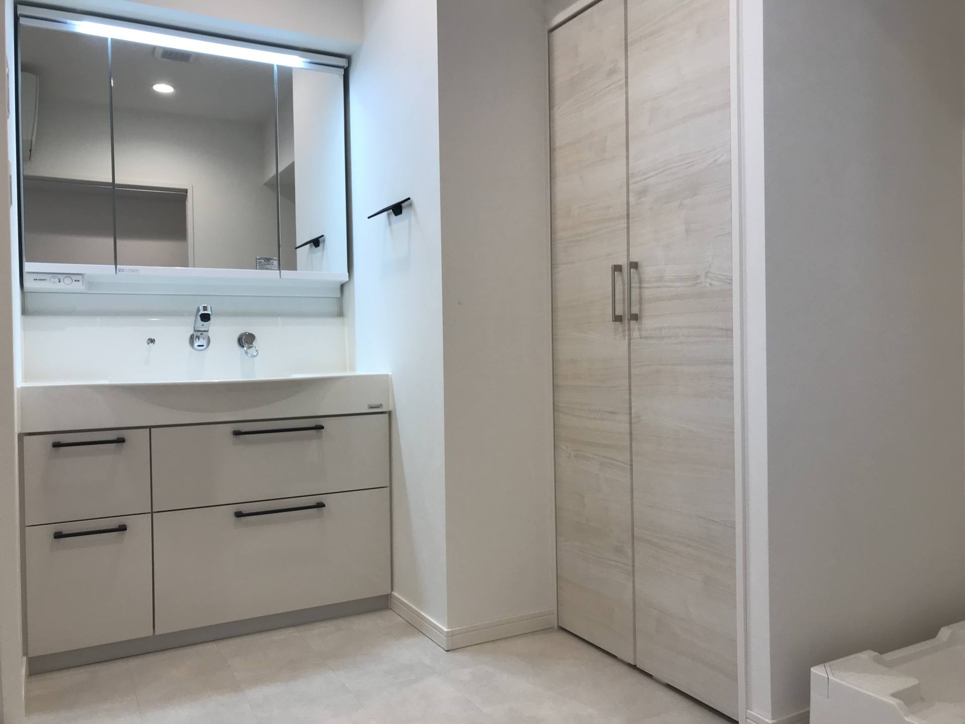 盥洗室通常有專門的洗面臺、鏡面燈、鏡子、置物架或鏡箱、洗面盆,水龍頭以及洗面盆下面的收納空間,配套完備、使用便利。