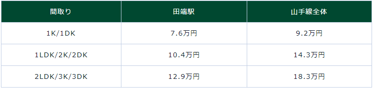 由此不難看出,不管是哪種戶型,田端站的租金水平都明顯低于山手線各站,說是山手線上房租最便宜的街區(qū)一點(diǎn)都不為過。對于想住在治安好、出行便利且租金較低的安靜街區(qū)的人來說,田端站是非常推薦的地方。