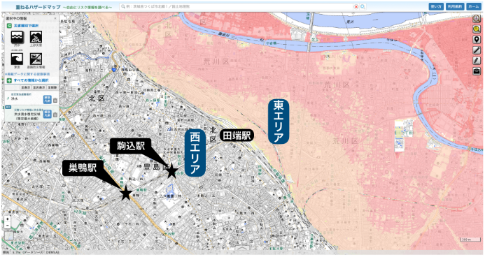 由上圖可以看出,田端站的整個(gè)東部區(qū)域都有“1m~5m”浸水的風(fēng)險(xiǎn),是否真的要住在田端?如果在附近找到了喜歡的房子,建議選擇2層以上的房間居住比較安全。如果擔(dān)心的話,也可以考慮一下附近水災(zāi)風(fēng)險(xiǎn)較低的“駒込站”和“巢鴨站”等車站吧