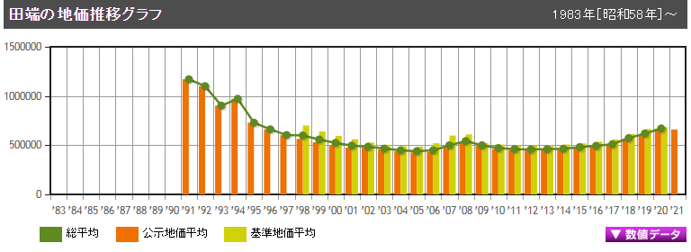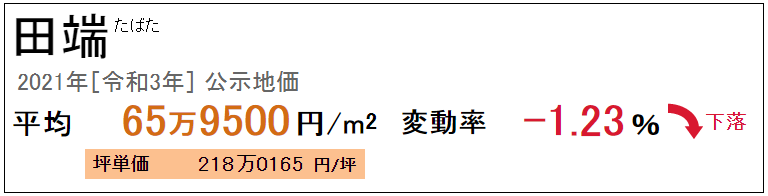 田端站是東京23區(qū)內(nèi)北區(qū)及山手線上的車站,2021年公示地價(jià)為每平方米65.95萬日元,多年來呈持續(xù)上漲趨勢,因受新冠疫情的影響下降了1.23%。