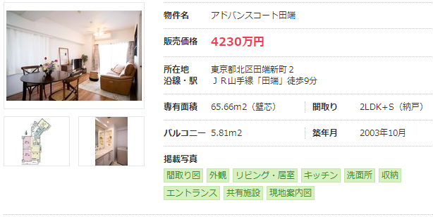距離JR山手線田端站步行9分鐘,面積為65.66㎡,于2003年竣工的2LDK的二手房售價(jià)為4230萬日元。