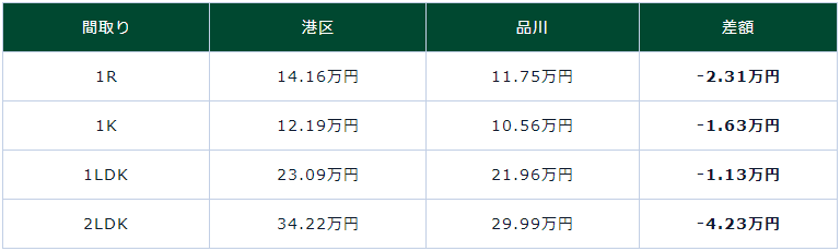 品川站便利性好,商業(yè)設(shè)施也很豐富,又屬于高尚社區(qū),但與港區(qū)內(nèi)的平均房租相比卻相對(duì)便宜,租房的性價(jià)比較高。下面我們將港區(qū)平均房租水平與品川站步行10分鐘以內(nèi)的房租行情進(jìn)行比較: