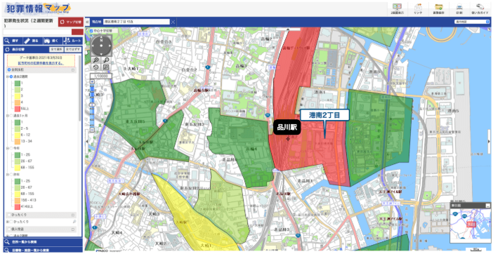 品川車站右側(cè)的區(qū)域犯罪件數(shù)較多,原因是這邊有眾多的居酒屋。地圖中出現(xiàn)的“港南2丁目區(qū)”的犯罪發(fā)生件數(shù)多得可以和“新宿歌舞伎町”相比擬,所以回家時(shí)間晚的女性最好盡量住在更安全的街區(qū)。