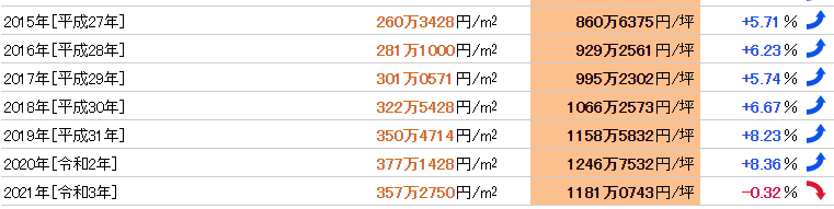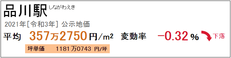品川所在的港區(qū)是東京的富人區(qū)之一,品川站2021年公示地價(jià)為每平方米357.275萬日元。近年來地價(jià)均穩(wěn)步上升,因受新冠肺炎疫情的影響,今年略下降了0.32%。
