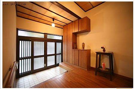 日本大部分的房子,拉開大門進入玄關時,并不會直接看到屋內,也不會直接對著廁所,更不會是亂七八糟的一團,進門只可能是面對一面墻或是一個屏風,墻上一般都會掛些看起來清新溫馨的自然風景畫,屏風的圖案也大多是風景畫或者吉祥、喜氣、富貴的字樣,這大概跟傳統的“風水”有關。玄關的布局規矩、講究,通過玄關的布置,也可以對主人的品味有所了解。玄關更代表了主人的“臉面”。