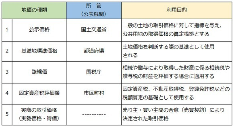 這個“基準地標準價格”是指基于國土利用計劃法的基準地土地價格,每年由各都道府縣公布。 而關于土地價格,則大多使用“公示地價”,公示地價是國土交通省根據地價公示法評價的標準值土地價格。 兩者的使用目的相似,被賦予作為土地交易的基準指標的作用。 另外,土地價格還有“路線價格”(道路沿線土地價格)、“固定資產稅評估價”和“實際交易價格”,所以日本的地價由“1物5價”組成。 根據使用目的不同存在5種地價,比如繼承財產的評價方法使用“路線價”和“固定資產稅評估價”便可以導出所要繼承財產的評估價值。 以繼承稅和贈與稅相關的財產評估為目的的土地價格是“路線價格”,用于評估房地產等固定資產的土地價格是“固定資產稅評估價”。