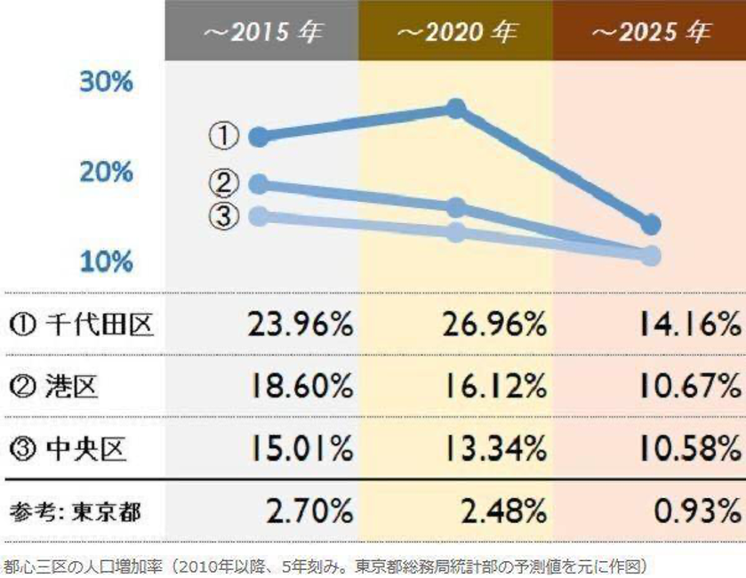 與此同時,港區還興建了多個高級公寓項目,生活配套設施齊全。眾多高收入者及雙職工家庭都居住于此,部分從郊區回流到都市的家庭也選擇在港區居住。從東京23區統計數據看,人口回流的趨勢至少將持續到2030年。“千代田區”、“港區”、“中央區”等都心三區,預計到2045年人口仍將繼續增加。