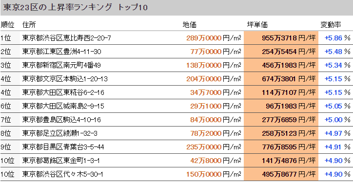 東京23區內地價漲幅排名前10位如下: