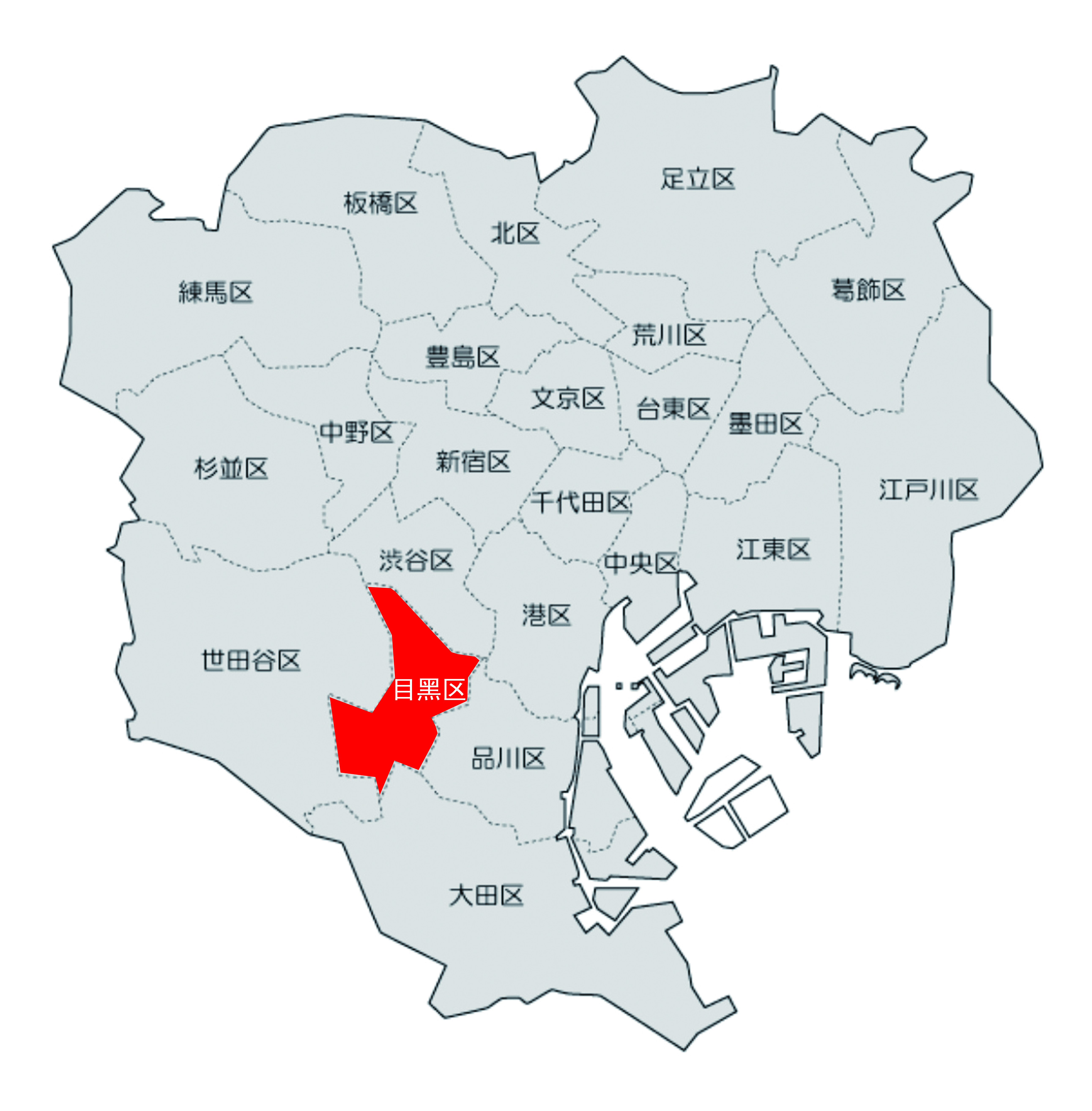 目黑區位于東京23區的西南部。北部接連澀谷,東品川,西世田谷,南大田的各區。該區每年都會出現在日本人最想居住地區的排行榜上,包括自由が丘,八雲、柿の木坂、駒場、青葉臺、上目黒、中目黒、三田等一系列高級住宅區。區內有多所高校和使館,非洲國家駐日使館多在此區。坐落于目黑區內的以東京大學,東京工業大學為首的代表日本最高學術水平的國立大學十分有名。