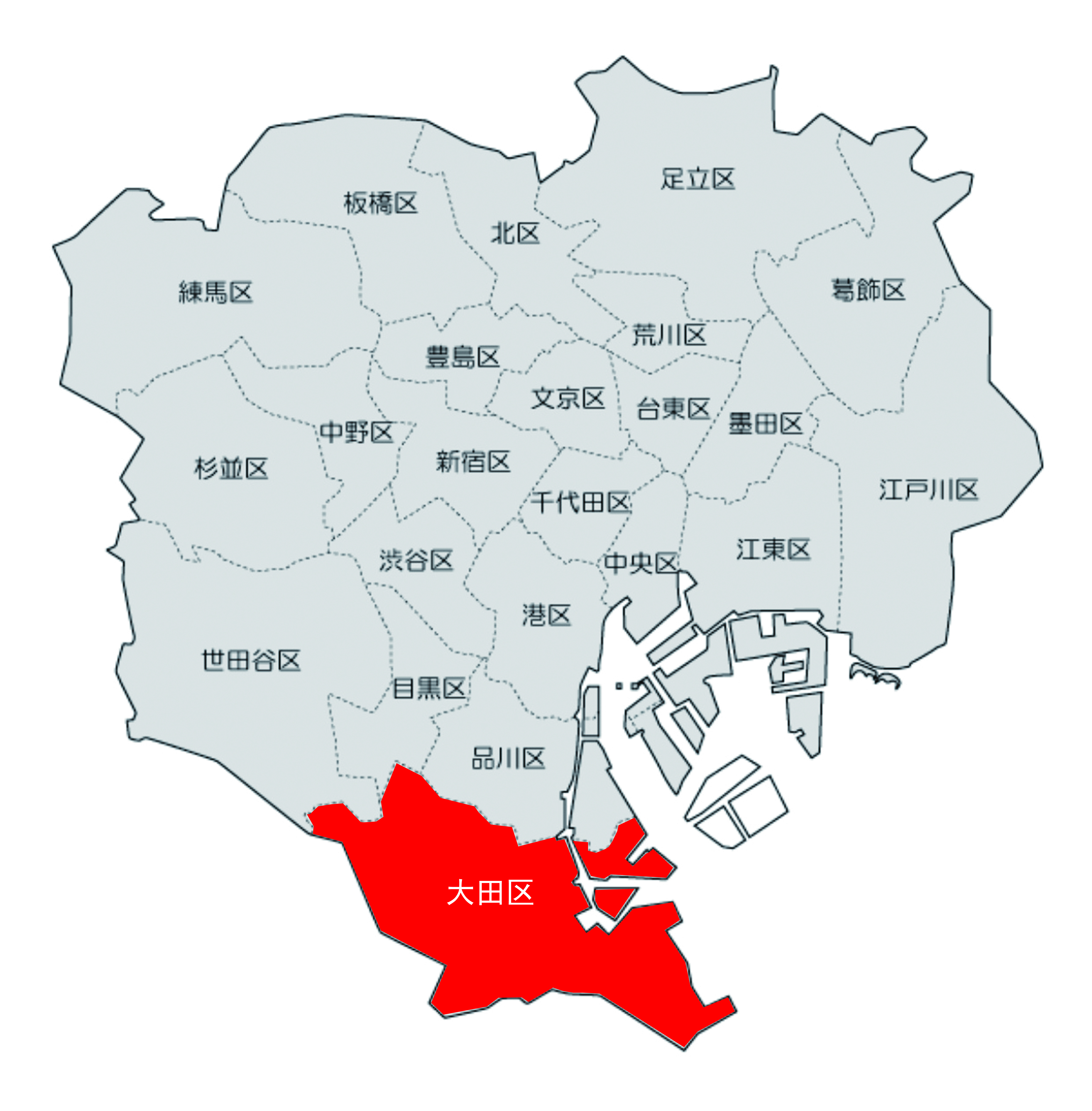 大田區位于東京23區的最南部。東部有羽田機場,占大田區面積的三分之一。大田區到埼玉縣川口市和千葉縣市川市有相同的距離,并隔著多摩川與神奈川縣川崎市相接。在占有大部分區的平原上,市街區蔓延開來,大廈、公寓等鱗次櫛比。