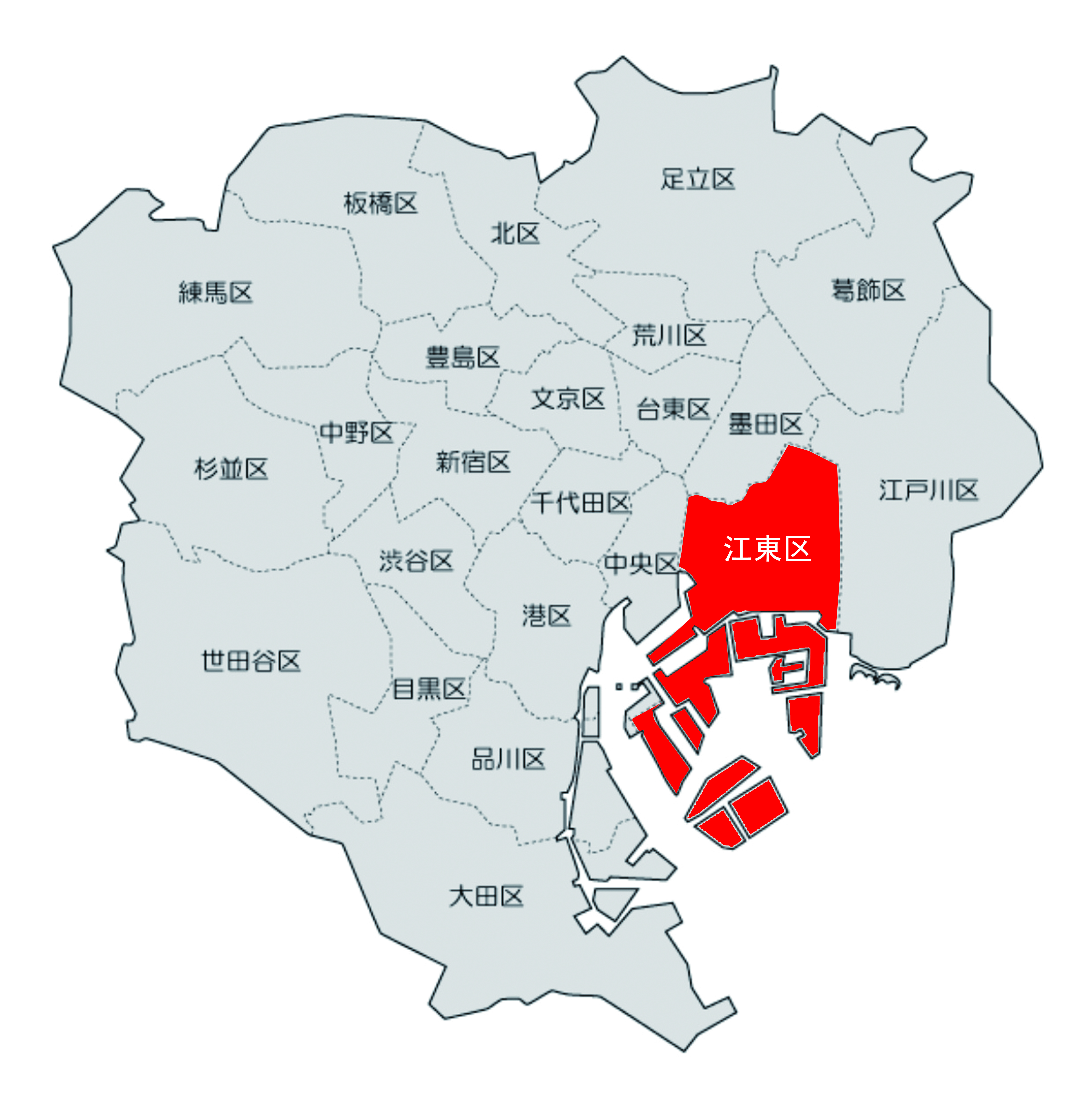 江東區是東京的特別區之一,是一個新興的發展區,位于東京23區的東部。江東區南臨東京灣,由于區內運河與橋梁眾多,亦被稱作為“水彩都市”。它由一系列道路和水道組成,船經常在住宅區附近出入。在江東區內有從東京大都會地區和錦系町、龜戶二級市中心劃分出來的沿海分中心,其中包括兩個分市中心,因此江東區聚集了許多游客和上班族。