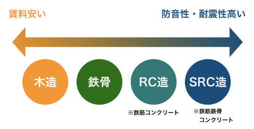 不同的房屋類型和結構等對售價及租金水平也有影響。一般的房子基本分為木造、鐵骨造、鋼筋混凝土造(RC)、鋼筋鐵骨混凝土造(SRC)。隔音效果、抗震性、價格水平等逐級遞增。一般一戶建(いっこだて)和低層公寓(アパート)為木造和鐵骨造的比較多;高層公寓(マンション)和高級公寓(タワーマンション)則是RC造和SRC造。隨著隔音性、耐震性等性能的遞增,房價也隨之上升。