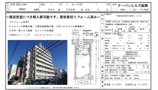 這個1991年鋼筋混凝土建造的1K戶型的南向高層公寓,距東京千葉縣的中心-船橋站步行僅10分鐘,有京成線、JR中央總武線、總武快線等多條線路可以利用,每個月的管理修繕費不超過1萬日元,售價僅為650萬日元(約合34萬人民幣),月租5萬日元左右,租金回報率超過7%。這個價格多年來保持穩定,未來變現也較為容易,是一個較優質的投資項目。