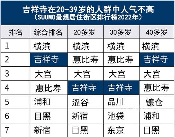 雖然吉祥寺在20多歲的年輕人眼中看似不受重視,不過在40多歲的中年人群體中卻一直保持著超高的人氣。在2014年車站改造工程完工之后,吉祥寺的居住環境和交通便利性大幅提升,去新宿、澀谷等人流集中的地方也非常方便,因此吉祥寺多年來都保持了高人氣。