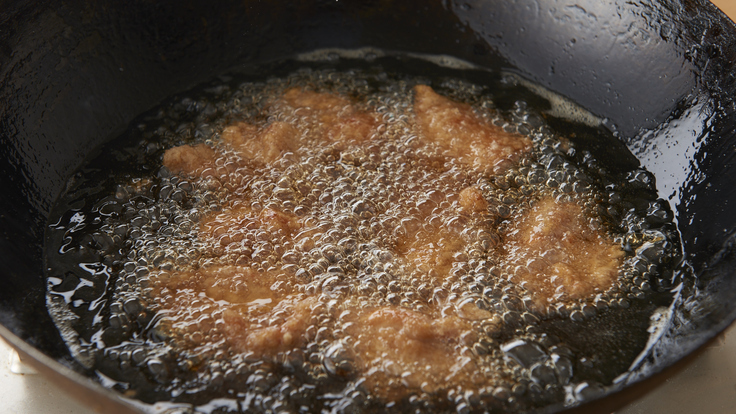 *油炸約2分鐘后,將雞塊翻個(gè)身,再炸1到2分鐘,待雞塊浮起即可出鍋。