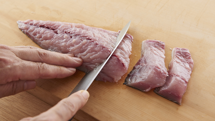 *用刀分離魚骨和魚肉,剔除其余的大魚骨。將魚身切成間距約2厘米大小的魚塊。切魚塊時(shí)可斜刀切,這樣切出來的魚塊也會(huì)有傾斜角度,便于料理。