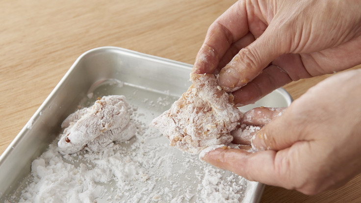 *將雞塊包裹上淀粉。