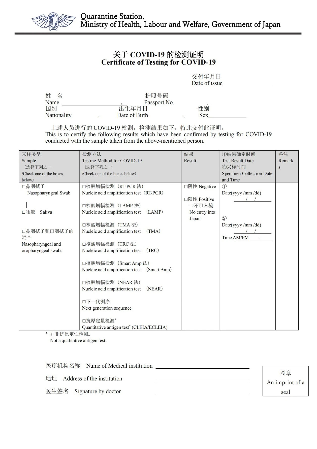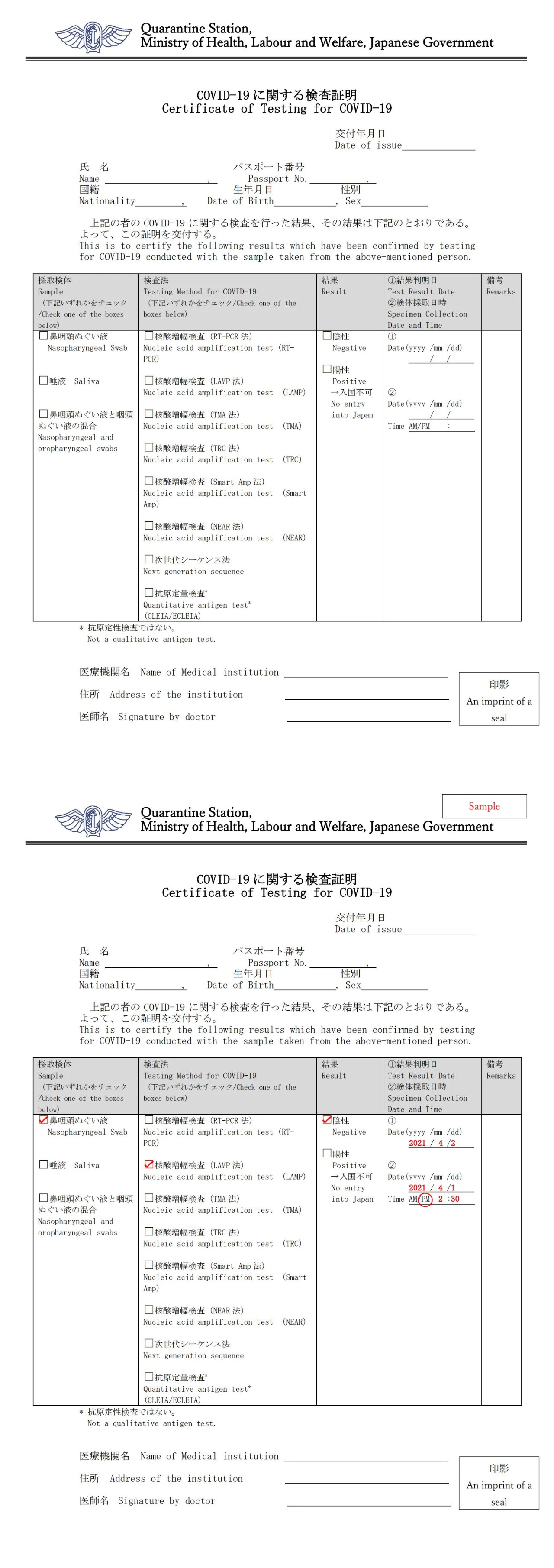 入境日本時也無需隔離,僅需提供被認可的三劑疫苗接種證明或PCR檢測72小時內陰性證明即可。72小時陰性證明書(注:從采樣到搭乘預定航班出發時刻為止的時間)最好使用英中或日中的符合日本厚生勞動省的指定格式: