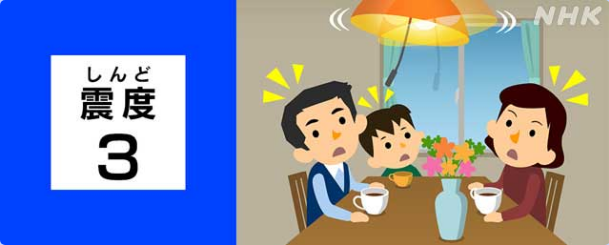 建筑物中的大多數人都能感受到震度3的地震,也比較容易發現吊燈等物品的晃動。