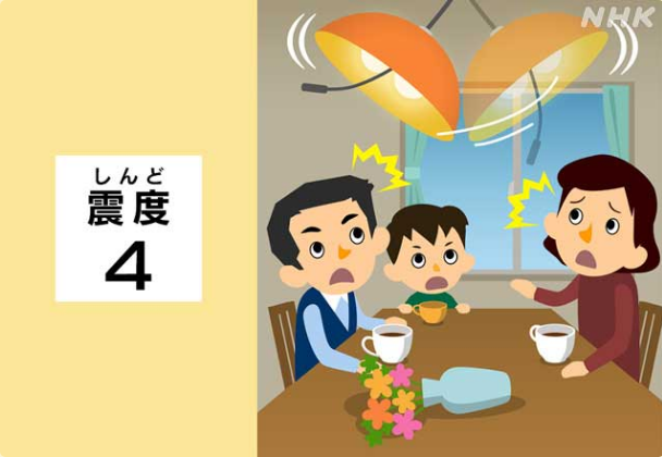 震度4的地震產生的晃動感可能會讓很多人感到吃驚,吊燈等物品可能會大幅晃動,底座較小的花瓶等物品有可能被晃倒。