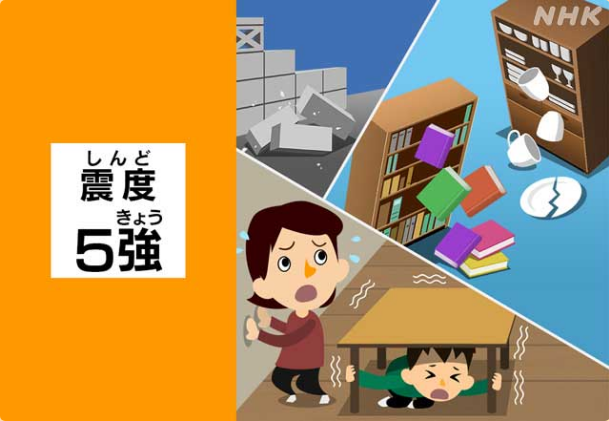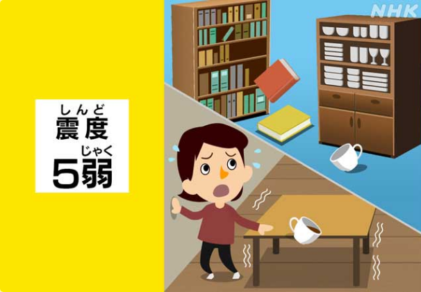 震度5弱的地震會讓多數人開始恐慌,會不自覺地扶住周圍的桌子或墻等物品,書架上的書或碗柜里的碗有可能會掉落。