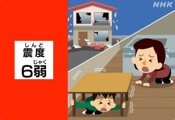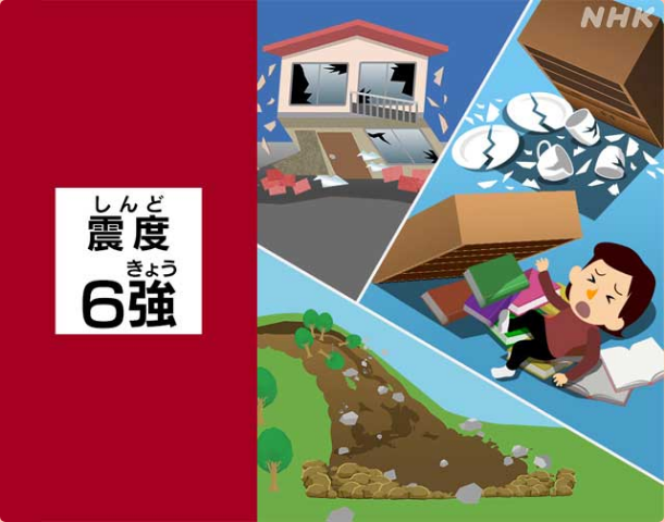 震度6弱的地震讓人站立變得困難,玻璃或墻體瓷磚可能會碎落脫落,一些樓齡較老的木造一戶建房頂的瓦片也可能掉落下來,房門有可能因為建筑物發生變形而難以打開。