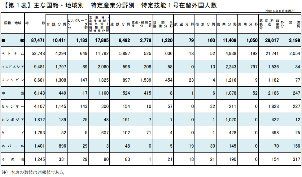 日本政府于2019年4月推出了“特定技能”的政策,以便吸引更多的海外勞動力到日本務工。設定該在留資格是的目標是,希望在5年內招募34.5萬海外人士申請該簽證。由于疫情的影響,截至2022年6月持有特定技能簽證的在日外國人為87472人,其中僅有1人持有特定技能2號簽證。