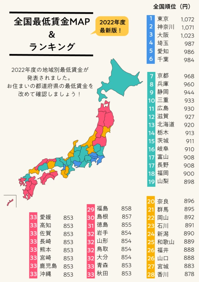 日本政府要求用工單位對待外籍工作者與日本人“同工同酬”,不能區別對待,不得低于日本用工當地的最低工作水平,也不能無故降低薪資標準。如千葉縣的最低時薪為984日元,那么在千葉縣工作的特定技能生的時薪也不得低于這一水平。