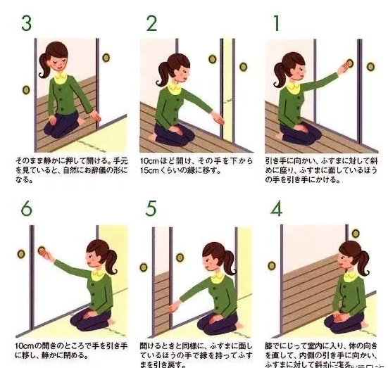 在一些講究的日式餐廳,打開榻榻米包間的隔扇門一共分三步,首先扣住門環將門打開一個縫隙,第二步推動門的下沿將門打開約10-15里面的距離,確認外面沒有人以后,第三步再將大門完全打開,關門的步驟則正好反過來操作。據說這個方法也是從古代流傳下來的,最初也是擔心門外有刺客,所以要謹慎開門。