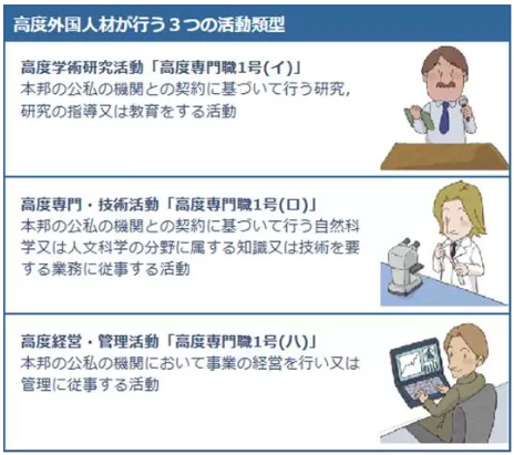 高度學(xué)術(shù)研究活動(dòng)「高度専門職1號(hào)(イ)」即高度學(xué)術(shù)研究活動(dòng):在日本或公或私的機(jī)構(gòu)中從事研究、研究指導(dǎo)或教育活動(dòng);