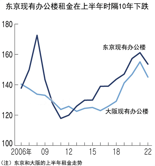 根據數據可以看出,東京的寫字樓租金下跌了1%,降幅與上次調查的下跌0.8%相比有所擴大;大阪的租金水平與以往持平。