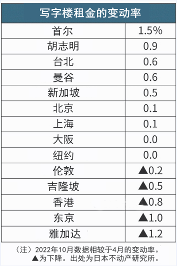 對于用于企業辦公的寫字樓租金水平的調查結果顯示,世界各主要城市的租金變動率有所差異。其中,東京的寫字樓租金出現了降幅擴大的趨勢。