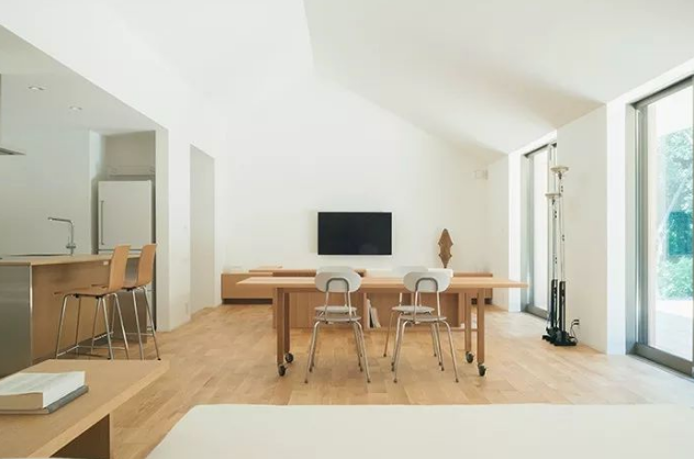 「陽之家」的內、外部都崇尚開放式的空間。屋內雖有各個功能分區,但是沒有墻壁加以隔斷,內部的“大開間”看著就那么通透!而且屋內充斥著“極簡”風格,白墻搭配原木地板及原木家具,與外墻的原木本色相呼應。就連家具的風格也是極度簡約,比如桌子或櫥柜下面沒有過多的隔板設計,寬敞的空間搭配MUJI的收納物件,便于移動和根據需求不斷調整,常換常新,平添生活的趣味。