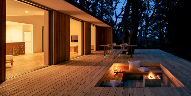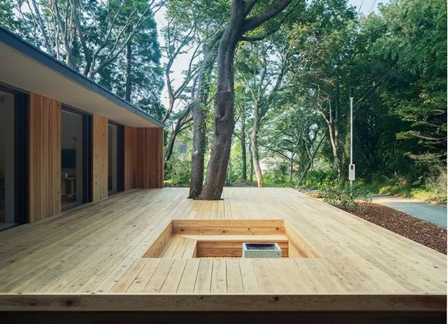 「陽之家」屋外還設計有超大開放式露臺,一部分還設置有下沉式休憩區。或是在陽光燦爛的清晨,或是星光璀璨的星空之下,隨性躺臥在原木長椅上,思緒也可以隨之徜徉在無拘無束的大自然中吧?和家人一起在露臺上燒烤,看著孩子追跑嬉鬧時歡快的笑臉,亦或約上三五好友,在和煦的陽光下一起享受下午茶的休閑時光,放飛自我,還原生活以本來的樣子。這樣的生活模式,大概也是MUJI想表達出來的建筑情感吧。