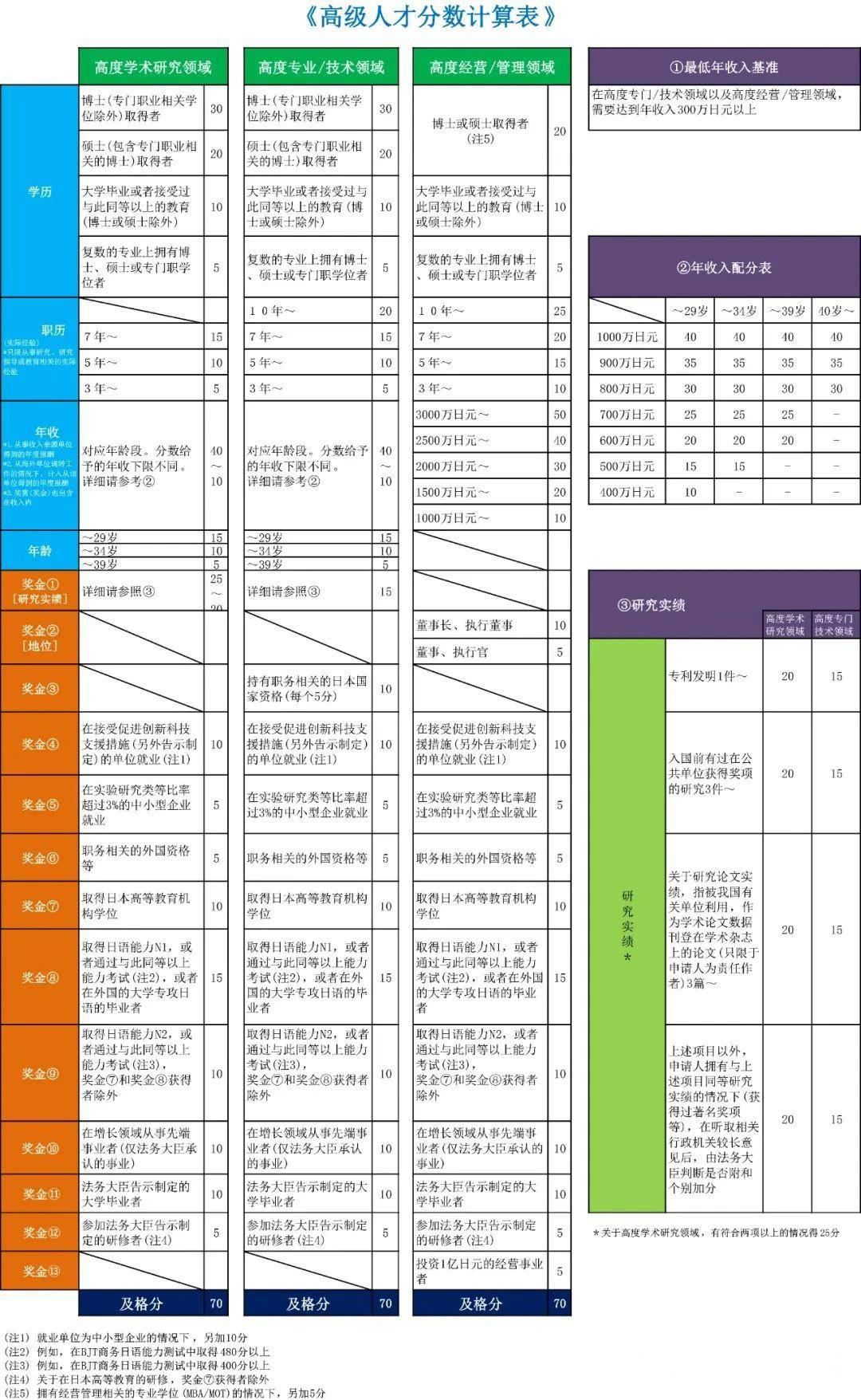 高度人才在普通的經營管理簽證之上,要求更多主要是流水額和社長的個人的年收入。目前高度人才有兩種方式,一個是申請人通過評分達到70分,最快3年可以申請永住;達到80分最快1年可申請永住。這個跟申請人的年齡、工作履歷、畢業院校、學歷、年收入等息息相關。