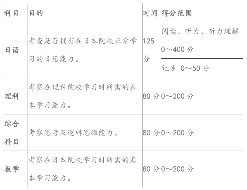科目:日語、理科(物理/化學/生物,一般針對理科生)、綜合科目(一般針對文科生)、數學1(一般針對文科生)、數學2(一般針對理科生)