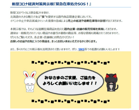 自從2月末以來,北海道內(nèi)的居民被要求周末避免外出,并自我居家隔離。自此之后,北海道除了多人聚集的活動被相繼取消之外,餐飲及觀光業(yè)客流量也急劇減少。因此,自2月10日開始,札幌商工會議所的官網(wǎng)主頁登載了“緊急庫存處理SOS!”的專題頁面,此舉意在為向餐飲、觀光等行業(yè)提供商品的企業(yè)和消費者之間搭建平臺,幫助企業(yè)稍微恢復(fù)一些營業(yè)額。