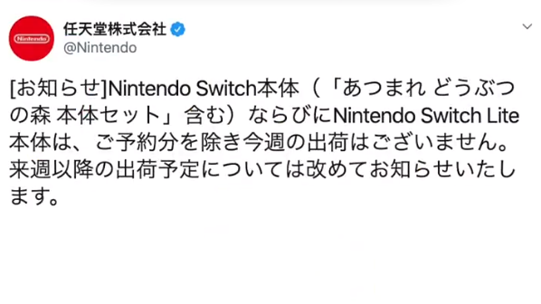 任天堂公司表示,停止發(fā)貨的原因除了因新冠肺炎疫情擴大給公司生產(chǎn)帶來的影響外,還由于因疫情而實施的全國中小學(xué)統(tǒng)一停課措施等原因,導(dǎo)致家庭游戲機的需求量急速增長。另外,3月20日發(fā)布的新款人氣軟件《集合啦!動物森友會》一經(jīng)上市發(fā)售,便在短期內(nèi)暢銷260萬套以上,游戲機主機的需求量也隨之增加,也被認為是原因之一。