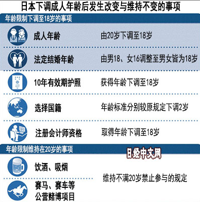 日本于2018年6月13日在參議院全體會議上獲得通過并正式成立的《民法》修正案,于2022年4月1日正式生效施行,在該修正案中,日本的成人年齡由20歲下調至18歲,女性可以結婚的年齡由16歲上調至18歲與男性相同。