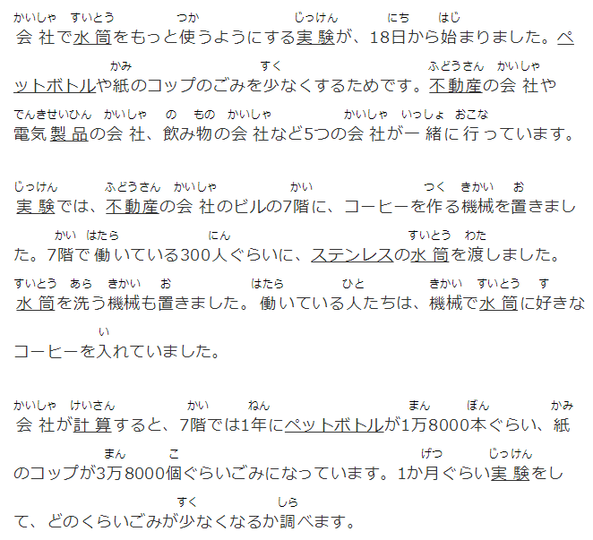 會社で水筒をもっと使うようにする実験が、18日から始まりました。ペットボトルや紙のコップのごみを少なくするためです。不動産の會社や電気製品の會社、飲み物の會社など5つの會社が一緒に行っています。