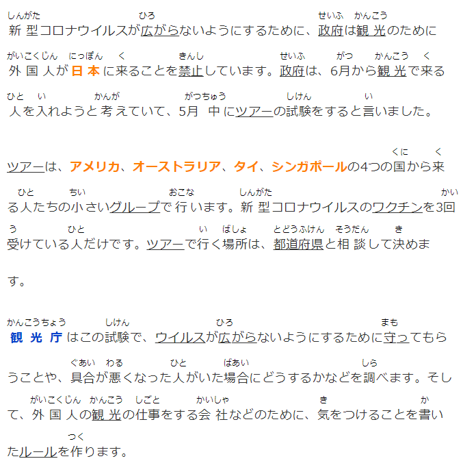 新型コロナウイルスが広がらないようにするために、政府は観光のために外國人が日本に來ることを禁止しています。政府は、6月から観光で來る人を入れようと考えていて、5月中にツアーの試験をすると言いました。
