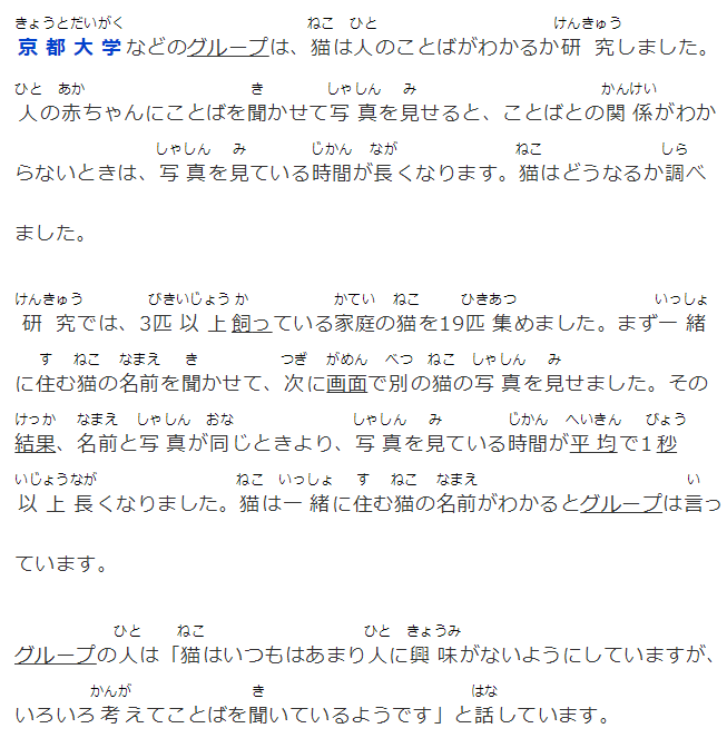 京都大學などのグループは、貓は人のことばがわかるか研究しました。人の赤ちゃんにことばを聞かせて寫真を見せると、ことばとの関係がわからないときは、寫真を見ている時間が長くなります。貓はどうなるか調べました。