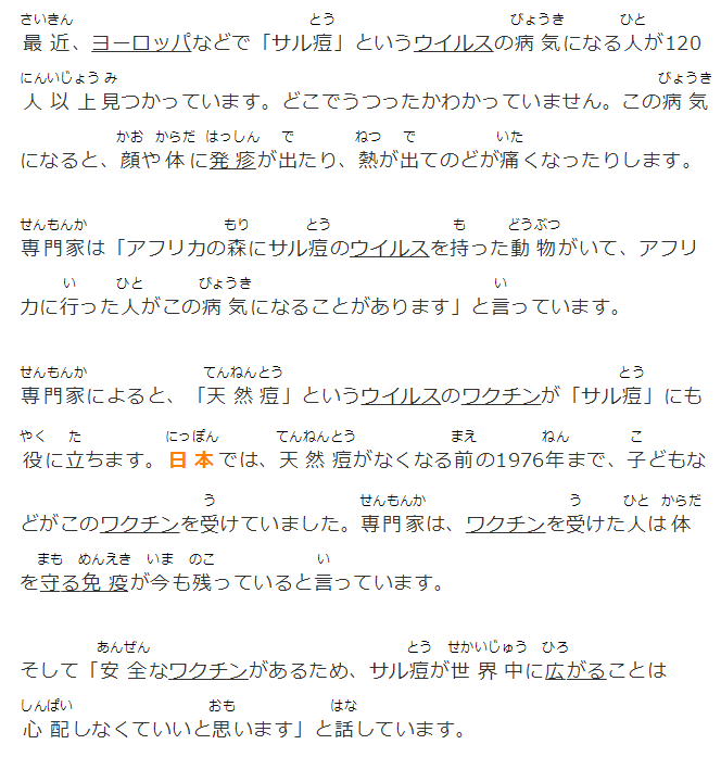 専門家によると、「天然痘」というウイルスのワクチンが「サル痘」にも役に立ちます。日本では、天然痘がなくなる前の1976年まで、子どもなどがこのワクチンを受けていました。専門家は、ワクチンを受けた人は體を守る免疫が今も殘っていると言っています。